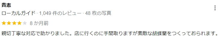 親切丁寧な対応で助かりました。店に行くのに手間取りますが素敵な胡蝶蘭をつくっておられます。